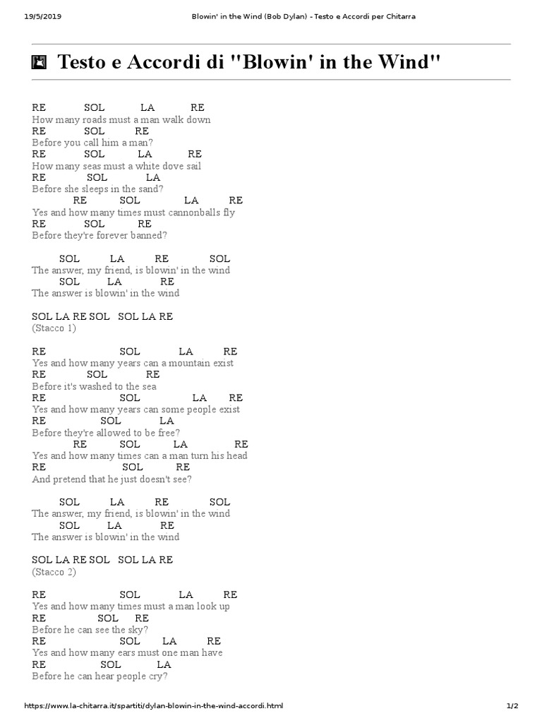 Blowing In The Wind Bob Dylan Sheet Music Guitar Chords