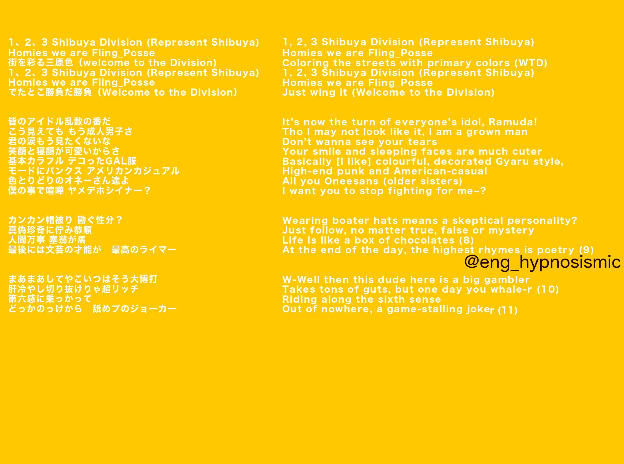 決して揺るがぬ無敵の無頼漢 言葉は今やマシンガン または未来導く羅針盤 uh 三位一体 it s show time 歴史に刻む俺らのスタイル 生死彷徨う遺. 催眠麥克風 division rap battle 日语 ヒプノシスマイク division rap battle 是由國王唱片所製作的男性18名聲優rap對決企劃 簡稱 ヒプマイ 催麥 由idea factory及otomate擔任角色設計 百瀬祐一郎擔任編劇. Division all stars のヒプノシスマイク division rap battle の歌詞.