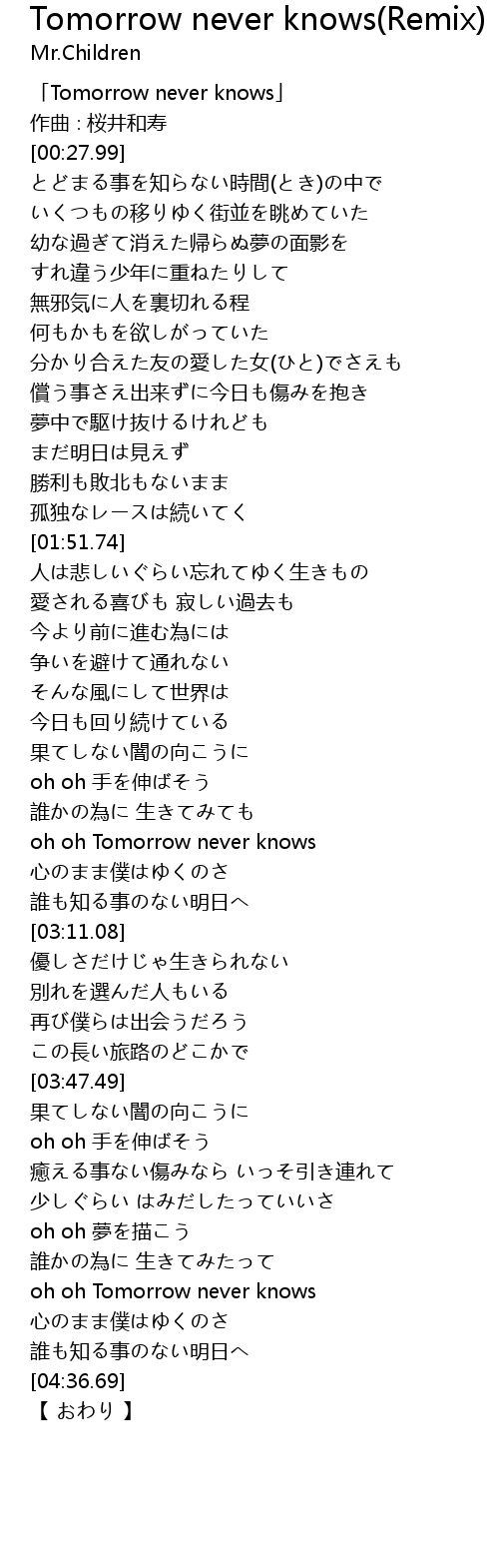 Paroles Lyrics Mr Children Tomorrow Never Knows