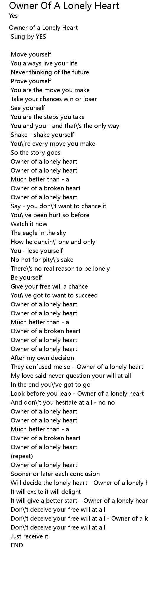 Owner Of A Lonely Heart Much Better Than The Owner Of A Broken Heart Post By Fionacatherine On Boldomatic