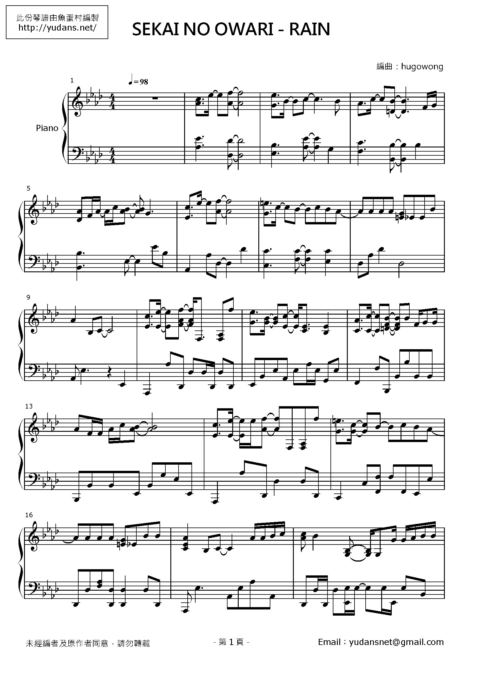 Rain 琴譜下載 魚蛋村yudan730 鋼琴譜網站